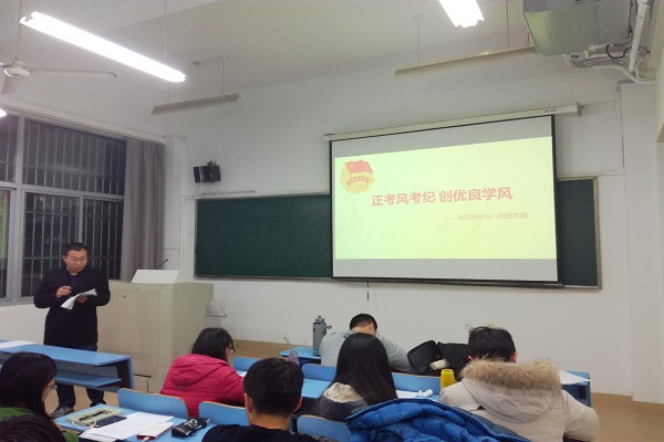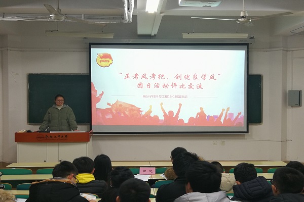 其中,高分子材料与工程16-1班团支部的同学们通过情景剧的新颖形式,展现考场违纪行为带来的严重后果,警醒大家一定要遵守考风考纪;同时该支部充分利用公众号平台,设立了“学资云盘大共享”和“读书·心灵”两个板块,并开展了“一千小时计划”,呼吁同学们在期末考试之前抓紧复习,提高学习效果。高分子材料与工程16-2班团支部则开展了重学风、正考风两次主题班会,并推出了课堂点到表、寝室长鼓励记录制度、共享笔记等活动将支部的学风考风建设从学期化变得日常化。化学工程与工艺16-1班团支部的同学们则以“学、思、行”三步走为活动主线,在支部内建立学习小组、加强课堂出勤率的检查,开展集体模拟考试、“四六级交流会”、“班主任座谈会”、“小班辅导”、“学风建设主题班会”等一系列活动,培养了同学们良好的学习行为习惯和严谨求是的学风。高分子材料与工程16-3班团支部、应用化学16-2班团支部进行了集中晚自习、小组学习、课业辅导、图书馆打卡、针对性考试等活动,发挥先进带头作用,以优带差,增强支部成员自觉学习的意识。化学工程与工艺16-2班团支部、化学工程与工艺16-3班团支部、应用化学16-1班团支部分别在班主任孙敏老师、陈章贤老师、吴祥老师的带领下,召开“正考风考纪,创优良学风”主题班会;组织支部成员进行“晚自习知识点串讲”、“班级委员每日一问”“押题法宝”小测试、“线上答疑”、“复习进程打卡”、“榜样带头,互相监督”的分学科有重点地督促学习的方式,并呼吁支部全体成员签署《诚信考试承诺书》。