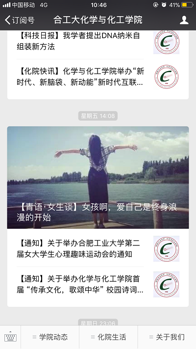 5月25日,该院心理协会在学院官方微信平台“合工大yl12311线路检测”上开设“青语|女生谈”心理健康交流版块,将分别从女大学生安全防范、自我修养、成长与成才等角度选题制作微信推文,通过微信平台进行心理健康知识宣传,鼓励女大学生树立积极的人格品质和生活态度。以线上推文的形式进行心理健康教育,有利于提升大学生心理调适能力,号召同学们关注自我、关爱自我、完善自我,受到了广泛关注与支持。