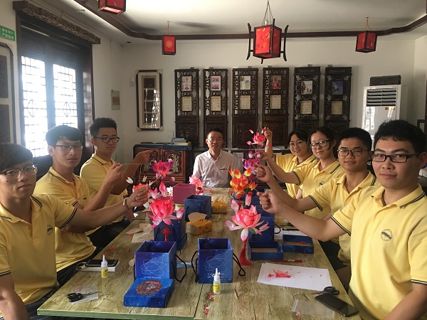 在随后的交流座谈会中,带队老师朱文拿和张老师介绍该院连续举办了十五届的灯笼文化节,并与张老师就校园灯笼节、灯笼设计制作大赛进行了深入探讨,张老师也提出许多建设性的意见。张老师强调现阶段大众的参与度很重要,能让大众关注到传统灯笼文化已十分不易,“如果那些愿意主动参与的人都得不到积极地引导和鼓励的话,那么谁还会参与这件事呢?因此,活动的举办如果能让参与者收获喜悦,获得成就感,效果就达到了。”而就在今天,团队成员们就做了一次参与者,在张老师的耐心指导下亲手制作了简易的莲花灯,看似简单的材料经过一步步的制作变身漂亮的花灯,队员们的内心惊讶而满足,脸上透露着喜悦。