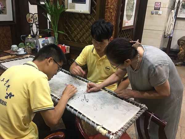 随后韩老师带领团队成员前往开封市文化客厅汴绣工作室,在这里大家见到了韩老师的得意门生田忠彦老师。田老师告诉成员们:“一副完整的汴绣作品需要很长的时间投入大量心血才能完成,即使是一片小小的树叶,就需要多种不同的绿色绣线,运用多种刺绣针法才可完成”。可见一幅作品的来之不易,其背后蕴藏的价值也是极深的,队员们在韩老师的指导下还亲身体验了绣制过程。