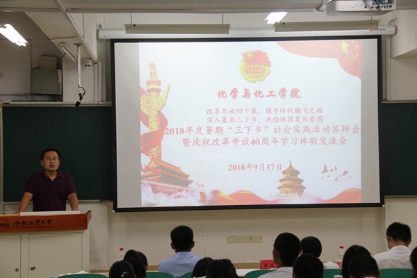 9月17日晚,yl12311线路检测于翡翠湖校区5教208召开“改革开放四十载,携手时代腾飞之路,深入基层三下乡,共绘祖国复兴蓝图”2018年度暑期“三下乡”社会实践活动答辩会暨庆祝改革开放40周年学习体验交流会。学院团委负责人、各年级辅导员、团队成员、低年级团学干部等一百余人参加此次交流会。