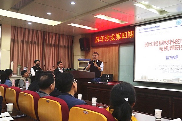 陆杨首先代表学院对宣教授的来访表示热烈欢迎,对宣教授长期支持学院发展表示衷心感谢。宣守虎教授简要介绍了长期以来在剪切增稠方向的研究工作,包括(1)剪切增稠胶的力学性能分析;(2)剪切增稠材料的力学性能调控;(3)剪切增稠复合材料的力-电耦合性能;(4)剪切增稠复合材料的防护性能设计。其相关应用领域主要包括磁流变材料与减振器、剪切增稠材料与防护服、柔性传感器与感应器、力学性能测试方法与仪器等。众多研究成果展现出了的巨大应用前景。