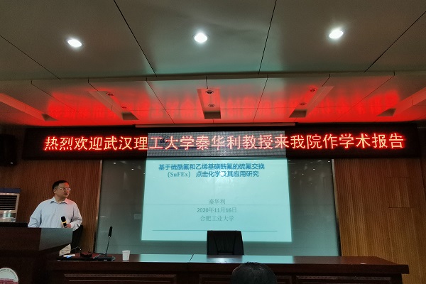 11月16日下午,武汉理工大学秦华利教授应邀前来yl12311线路官网进行了题为“基于硫酰氟和乙烯基磺酰氟的硫氟交换点击化学及其应用”的学术报告,报告于升华楼616举行,由常务副院长陆杨教授主持,参会师生约60余人。