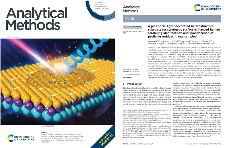 近日,yl12311线路官网2019级能源化学工程专业本科生在分析类著名期刊《Analytical Methods》发表了题为“A plasmonic AgNP decorated heterostructure substrate for synergetic surface-enhanced Raman scattering identification and quantification of pesticide residues in real samples”学术论文一篇,并被选为当期正封面报道。该项工作由我校微纳生化传感材料与器件实验室与中国科学院合肥物质科学研究院和安徽拓维检测服务有限公司合作完成,yl12311线路检测为第一完成单位和通讯单位,我院本科生李雪婷为第一作者,张茂峰副教授、吴玉程教授为校内通讯作者。近年来,研发团队高度重视本科生科研能力的提高和科研素质的养成,以大学生创新创业项目和互联网+大赛为依托,在大一新生中遴选热爱科研、勤于钻研的优秀学生进入课题组,通过教师指导、研究生传帮带的形式,全方位提升本科生的科研素养,截止目前本课题组培养的本科生已在ACS Sensors, Journal of Materials Chemistry C等国际期刊发表10篇论文。