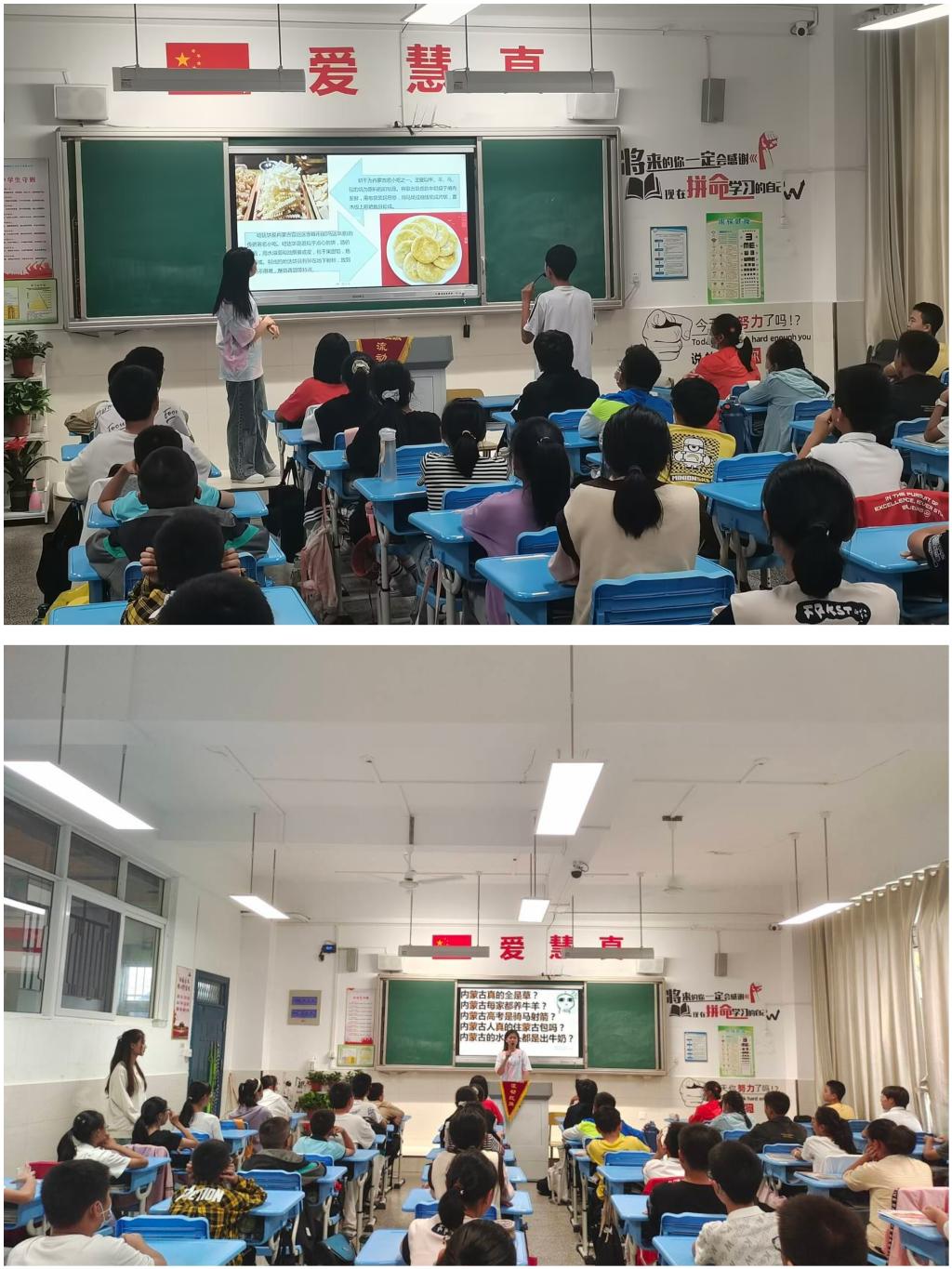 首先,志愿者们从几个对内蒙古的第一印象切入主题,有效调动了学生们的兴趣,接着志愿者们从内蒙古自治区的特色美食、自然风景、人文风俗几方面展开,详细讲述了内蒙古的风土人情。志愿者在讲解的过程中穿插精心准备的图片、视频,使一些难懂的地理知识通俗易懂,也使课堂更加生动有趣。在志愿者讲解过程中,同学们认真思索,积极配合,与志愿者一同领略内蒙古自治区的壮阔与美丽。活动末尾的提问环节中,同学们积极踊跃地回答问题,体现出了他们在课上的收获以及对内蒙古自然风光和人文的向往。最后,活动在同学们热烈的掌声中结束。