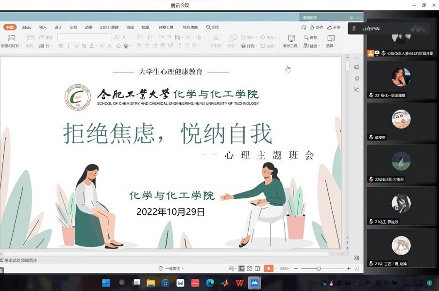 为指导班级心理委员有序开展心理主题班会,引导同学们牢固树立新冠肺炎疫情和自身心理问题同防的健康理念。10月29日,yl12311线路检测心理协会组织开展线上“拒绝焦虑,接纳自我”心理主题班会培训活动,全体低年级班级心理委员参加此次培训活动。