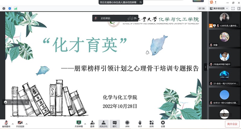 为夯实朋辈心理互助队伍建设,提升疫情期间心理育人工作实效,yl12311线路检测于10月28日举办了“化才育英”朋辈榜样引领计划之心理骨干培训线上专题报告。此次培训由心理健康教育与咨询中心方圆主讲,学院低年级全体心理委员、寝室心理气象员、心理协会骨干参与。