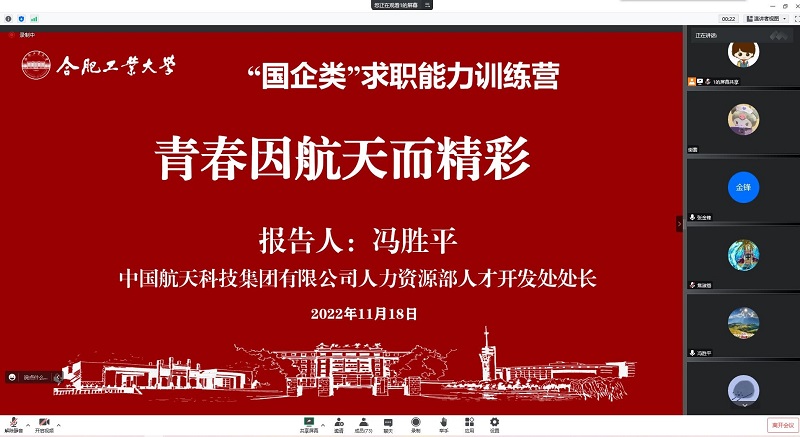 11月18日,yl12311线路检测组织开展“国企类”求职能力训练营专题报告会,报告会依托学生社区,分两校区线上线下同步开展。中国航天科技集团有限公司人力资源部人才开发处处长冯胜平应邀作报告会,报告会由学院党委副书记张金锋主持,yl12311线路检测、“国企类”求职能力训练营等500余名学生聆听了报告。