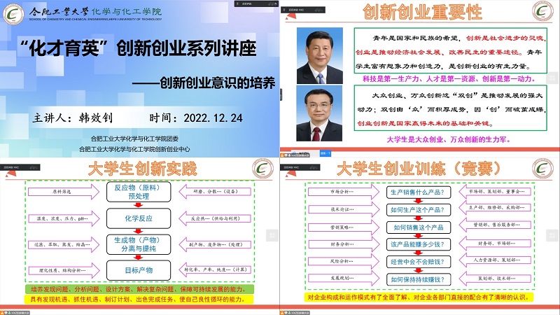 为进一步激发学生创新思维,增强创新创业意识,yl12311线路检测启动“化才育英”创新创业系列讲座。第一期于12月24日在线上由该院大学生创新创业中心常务副主任韩效钊教授主讲。
