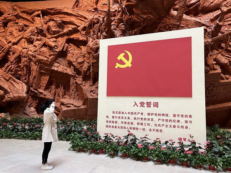 在纪念馆一楼大厅,面对鲜红的党旗,应用化学专业2019级本科生李寒雪举起右拳,带领支部党员们重温入党誓词。铿锵的誓言震撼着每一位党员的心,提醒大学生党员要时刻牢记使命与责任,为中华民族伟大复兴贡献青春和力量。