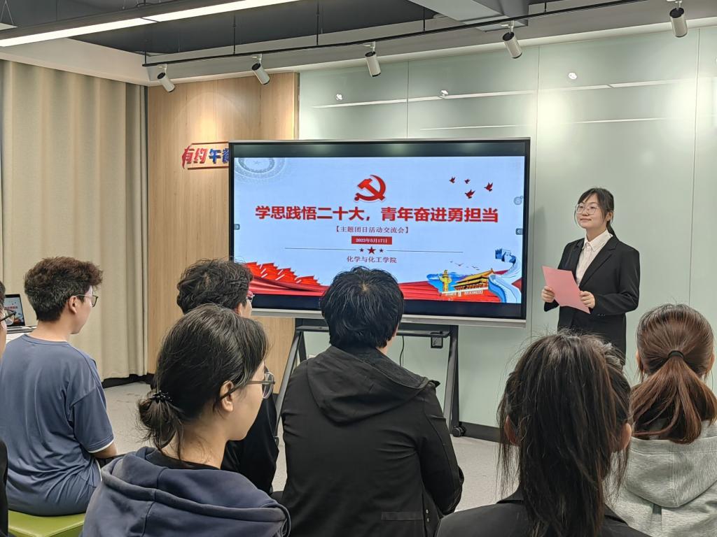 本次主题团日活动自四月启动以来,各团支部通过组织主题班会、集体观影、党史知识竞赛等活动进行理论学习,带动同学们深入学习党的二十大精神;积极拓展支部团日活动内容,通过搭建社区实践平台,组织开展了化学知识科普、消防安全知识宣讲、垃圾分类宣传、青春接力志愿服务等多维度多形式活动13场。交流会上,学院2021、2022级团支书依次通过ppt宣讲的形式,向大家充分展示了各团支部的活动开展思路及成果,并交流了心得体会。