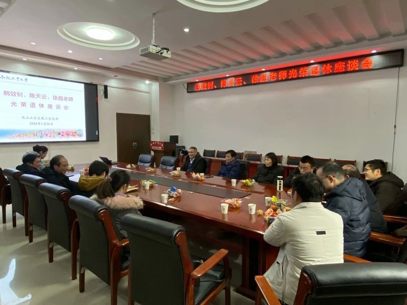 2024年1月26日下午,化工工艺系教工党支部在韩效钊、陈天云、徐超老师光荣退休之际举办老教师光荣退休座谈会,会议由支部书记吴雪平主持,学院党委书记秦广龙、副院长张大伟和工艺系全体教师出席座谈会。