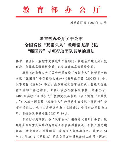 全国高校“双带头人”教师党支部书记“强国行”专项行动旨在创新落实立德树人根本任务,充分发挥“双带头人”的示范引领作用,聚焦服务国家重大战略和地方经济社会高质量发展,积极开展党建联建、教育服务、科技赋能、实践育人等各项任务,在以中国式现代化全面推进强国建设、民族复兴伟业新征程上砥砺新担当、展现新作为。