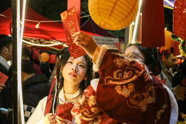 活动现场,繁灯如昼、交相辉映,各类灯谜雅致新奇;青年学子身着汉服衣裾蹁跹、簪笄挽髻,手擎非遗鱼灯而游,传统文化之美与青春之梦绘成一幅流动的画卷。活动还开设了“飞花令”“滚铁环”“夹乒乓球”“套圈”等趣味项目,带来了一场弘扬中华优秀传统文化的艺术盛宴。