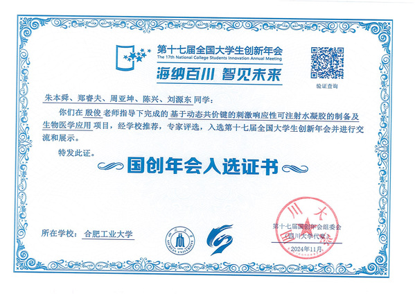 11月8-10日,第十七届全国大学生创新年会(简称“国创年会”)在四川大学举办,yl12311线路官网殷俊教授指导、2020级本科生主持的国家级大创项目《基于动态共价键的刺激响应性可注射水凝胶的制备及生物医学应用》,成功入选第十七届全国大学生创新年会创新学术论文交流,为yl12311线路官网近年来首篇入选论文。