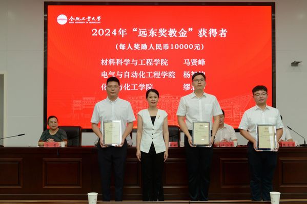 远东控股集团人力资源服务中心总监张妍妍在致辞中回顾了自2011年起,校企在人才共育、科研共创、平台共建等领域的合作成果,介绍了未来更深层次的合作规划。她表示合工大校训与远东企业使命高度契合,期待共探“新工科”育人模式,搭建产学研用一体化平台,携手为制造业强国注入青春动能。并为三位获得远东奖教金的老师颁发获奖证书。